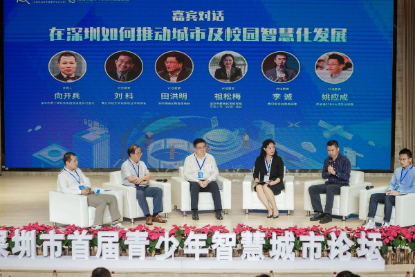 在深圳市青少年科技实践促进会的执行会长向开兵主持的嘉宾对话环节中,刘科院士、福田区教育局局长田洪明等嘉宾围绕如何推动深圳城市及校园智慧发展进行了深入探讨。