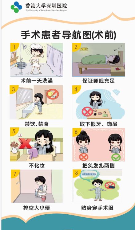 健康有效的手术科普是确保手术成功必要条件之一,好的术前科普能使手术患者普及手术相关知识,充分做好术前准备,防止因术前准备不妥而导致手术延期或妨碍手术正常进行;除此之外,还能使患者主动配合手术,提升患者对手术的信心,减轻心理压力。《手术患者导航图》挂图是关于手术患者围术期的简单流程科普。该图以通俗易懂的动漫对白设计,极富科学性、普及性、趣味性,能使手术患者迅速了解手术相关科普,从而减轻患者的心理压力,提升手术护理依从性,减少延期手术,提高手术配合质量及手术室运行效率。