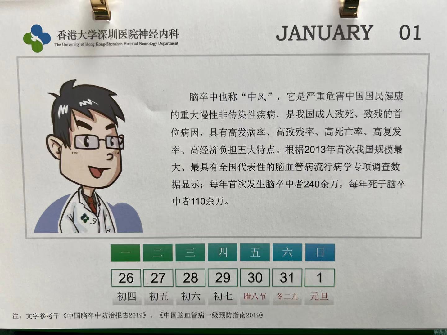 该科普作品将通过循证的方法筛选出的患者和家属关注的脑卒中二级预防知识(均来自专业书籍及临床实践指南),转化成大众容易接受的通俗易懂的语言并配以专业配套漫画插图,以每周一页的形式制作成台历(正面卒中相关知识、反面血压及血糖记录单),帮助患者及家属理解和掌握卒中二级预防知识的同时协助患者健康监测和保持良好的健康行为。本台历于2021年起发放给住院的脑卒中病人及卒中门诊的就诊患者,收到病人、家属的一致好评。在基础上我们每年更新,不算修订和完善印制了2022年及2023年的宣教台历。
