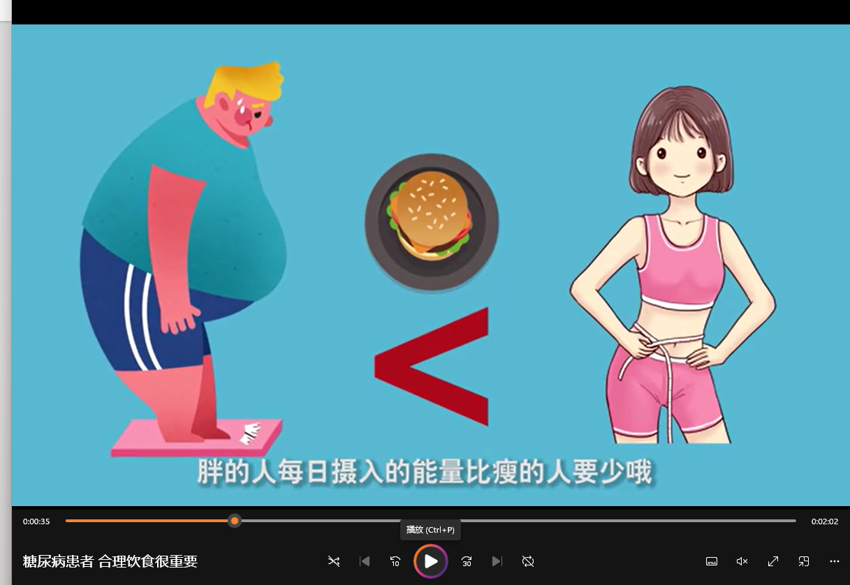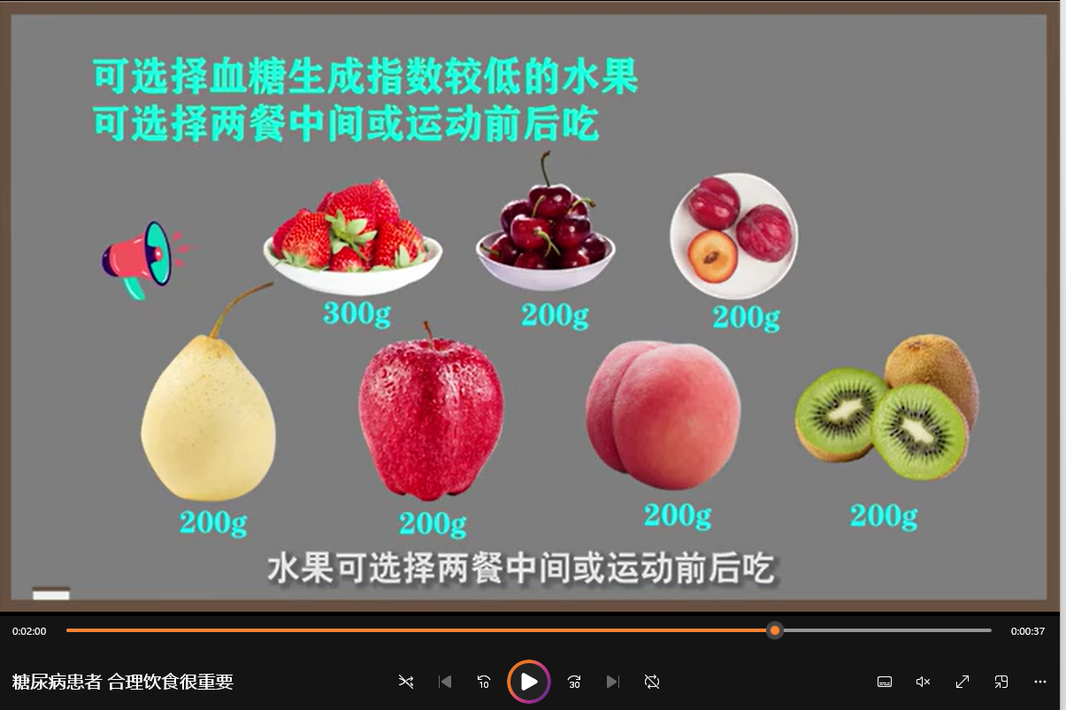 糖尿病人群血糖控制是关键。饮食和血糖息息相关。通过动画形式,告诉糖尿病患者饮食种类和量。每日能量需要量=(25-35kcal)×标准体重。生活中把90 kcal(相当于一个鸡蛋的热量)的食物作为一标准份,每日需要摄入1600kcal的热量,相当于18份食物。糖尿病患者要合理均衡饮食。粗细搭配,优先选择粗粮,主食定量。肉类建议每天吃2-3份。蔬菜每天吃300-500克,绿色及深色蔬菜要占一半及以上。每天1份水果。在两餐之间吃水果。每天一个蛋。奶类豆类天天有,每天保证约300ml的液态奶。每天食用相当于25克大豆的豆制品。通过科普视频,提高患者血糖控制的意识,达到早预防、早治疗的目的。