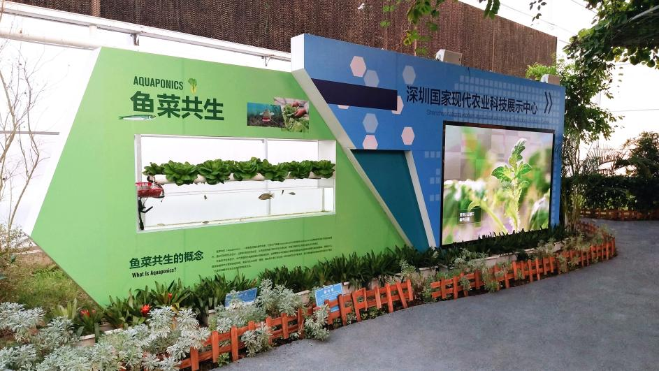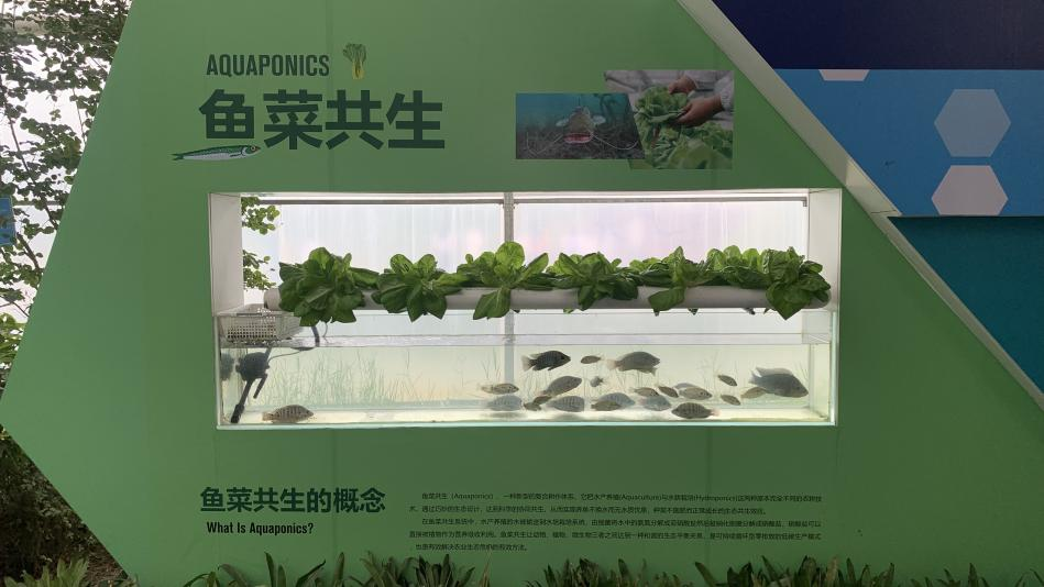 “鱼菜共生”是一个小型系统展示,它是一种新型的复合耕作体系,它把水产养殖与水耕栽培这两种原本完全不同的农耕技术结合,通过巧妙的生态设计,达到科学的协同共生,从而实现“养鱼不换水而无水质忧患,种菜不施肥而正常成长”的生态共生效应。在鱼菜共生系统中,水产养殖的水被输送到水培栽培系统,由细菌将水中的氨氮分解成亚硝酸盐然后被硝化细菌分解成硝酸盐,硝酸盐可以直接被植物作为营养吸收利用。鱼菜共生让动物、植物、微生物三者之间达到一种和谐的生态平衡关系,是可持续循环型零排放的低碳生产模式,也是有效解决农业生态危机的有效方法。