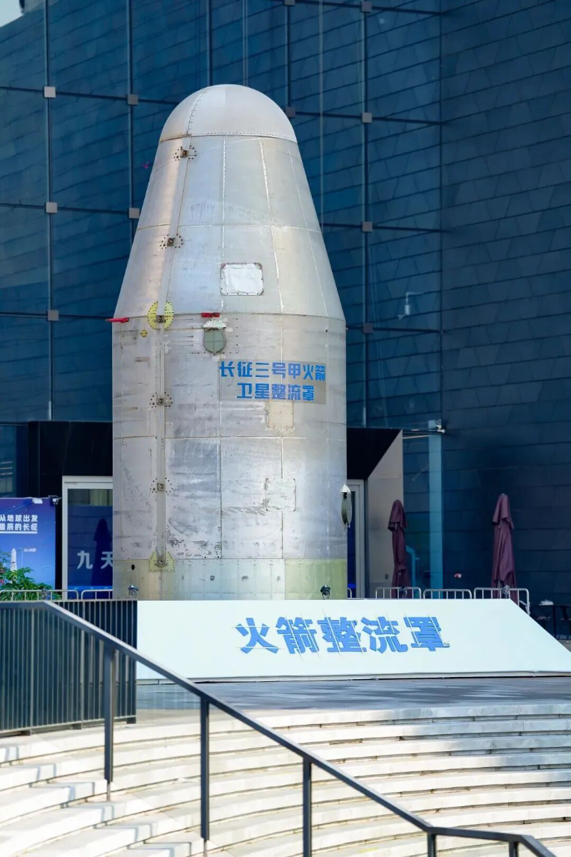 另一件明星展品 —— 长征三号甲火箭卫星整流罩,同样吸引着观众目光。作为我国高轨道卫星发射的“主力干将”,长征三号甲火箭系列曾成功托举嫦娥一号月球环绕器、北斗导航卫星等重要载荷进入太空,而此次展出的整流罩,正是保护卫星穿越大气层的 “太空铠甲”,其精密的结构设计与耐高温材质,直观呈现了我国航天工程的制造水平。